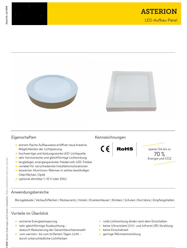 Die ASTERION ist eine runde LED-An / Aufbauleuchte mit 15W Leistung und geringer Aufbauhöhe von lediglich 40mm, die sich sowohl für die Decken- als auch für die Wandmontage eignet. Durch ihr zeitlos-klassisches Design fügt sie sich dezent in jegliches Interieur ein, sei es im Büro oder in Wohn-und Geschäftsräumen. Sie eignet sich daher hervorragend sowohl für den privaten Bereich als auch für Anwendungen im Handel und in der Industrie.