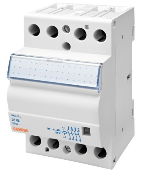 Gewiss Schütz GWD6724, Serie 90 AM – Bemessungsstrom 40 A (AC‑1/AC‑7a), 4 Schließer (4NO), Steuerspannung 230 V AC / 220 V DC, Modulbreite 3 Teilungseinheiten (TE), geeignet für DIN‑Hutschienenmontage. Ideal zur Steuerung von Lasten mit häufigen Schaltvorgängen.