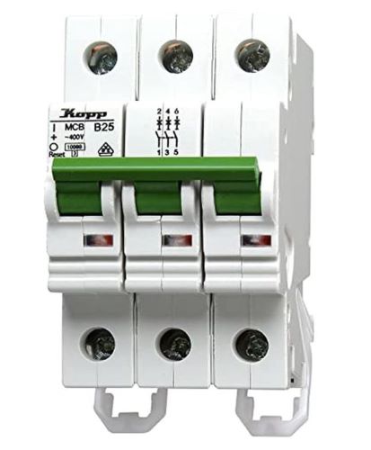 Der Kopp MCB/B25A Miniatur-Leitungsschutzschalter 3-polig (722530003) aus der Green Electric-Serie ist ein leistungsstarker Sicherungsautomat zur Absicherung von Drehstromkreisen mit 400V Spannung. Mit einem Nennstrom von 25 Ampere und der Charakteristik B eignet er sich ideal für Stromkreise mit geringen bis mittleren Einschaltströmen, beispielsweise für Beleuchtung, Steckdosen, Heizsysteme oder kleinere Maschinen in Wohn-, Gewerbe- und Industrieanlagen.