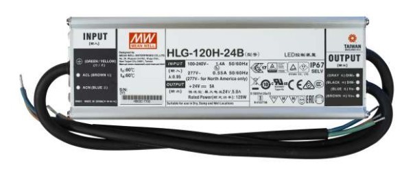 Das Mean Well LED-Netzgerät HLG-120H-24B liefert 120 W bei 24 V (5 A) im CV+CC-Modus. Mit IP67-Aluminiumgehäuse, 3-in-1-Dimmfunktion (1–10 V / PWM / Widerstand) und aktivem PFC ist es ideal für professionelle LED-Beleuchtung im Innen- und Außenbereich.
