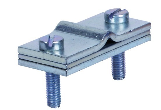 Hochwertiger Erdungsbandeisenverbinder Pollmann EV35 mit Zwischenplatte, geeignet für Flachband 30mm Breite und Rundleiter 8x10mm Ø , aus feuerverzinktem Stahl, ideal für Blitzschutz- und Erdungsanlagen.
